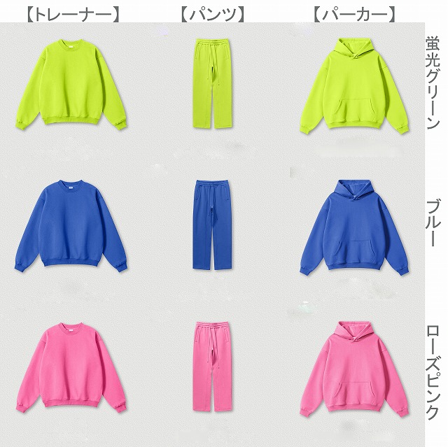 サイズ表記単位:CM 採寸に個人差があり1-2cm誤差がある場合がございます。 ▲【カラー】蛍光グリーン、ブルー、ローズピンク、アカ、ピンク、スカイブルー、ライトグレー ▲【素材】コットン、ポリエステル ▲【セット内容】トレーナー/生地345g ▲【サイズ】 S 着丈68cm バスト128cm 肩幅58cm 袖丈55cm M 着丈70cm バスト132cm 肩幅60cm 袖丈56cm L 着丈72cm バスト136cm 肩幅62cm 袖丈57cm XL 着丈74cm バスト140cm 肩幅64cm 袖丈58cm XXL 着丈76cm バスト144cm 肩幅66cm 袖丈59cm ▲【セット内容】パーカー/生地345g ▲【サイズ】 S 着丈68cm バスト132cm 肩幅60cm 袖丈55cm M 着丈70cm バスト136cm 肩幅62cm 袖丈56cm L 着丈72cm バスト140cm 肩幅64cm 袖丈57cm XL 着丈74cm バスト144cm 肩幅66cm 袖丈58cm XXL 着丈76cm バスト148cm 肩幅68cm 袖丈59cm ▲【セット内容】ジョガーパンツ/生地345g ▲【サイズ】 S 総丈99cm ウエスト66cm ヒップ114cm 裾口20.7cm M 総丈101cm ウエスト70cm ヒップ118cm 裾口21.5cm L 総丈103cm ウエスト74cm ヒップ122cm 裾口22.3cm XL 総丈105cm ウエスト78cm ヒップ126cm 裾口23.1cm XXL 総丈107cm ウエスト82cm ヒップ130cm 裾口23.9cm