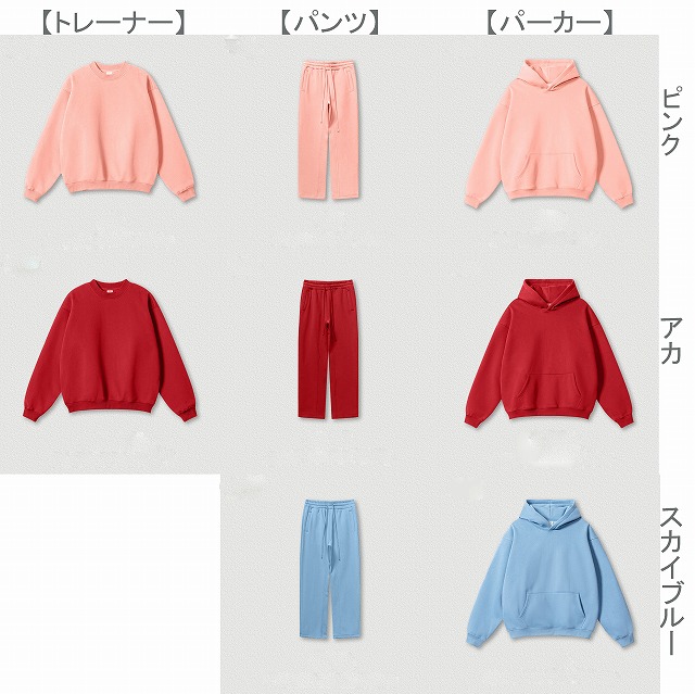 男女兼用デザインで、トレーナー・パーカー・パンツの組み合わせが選べます。