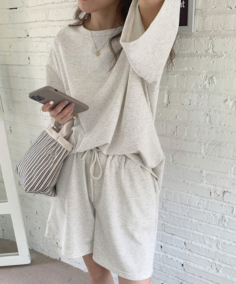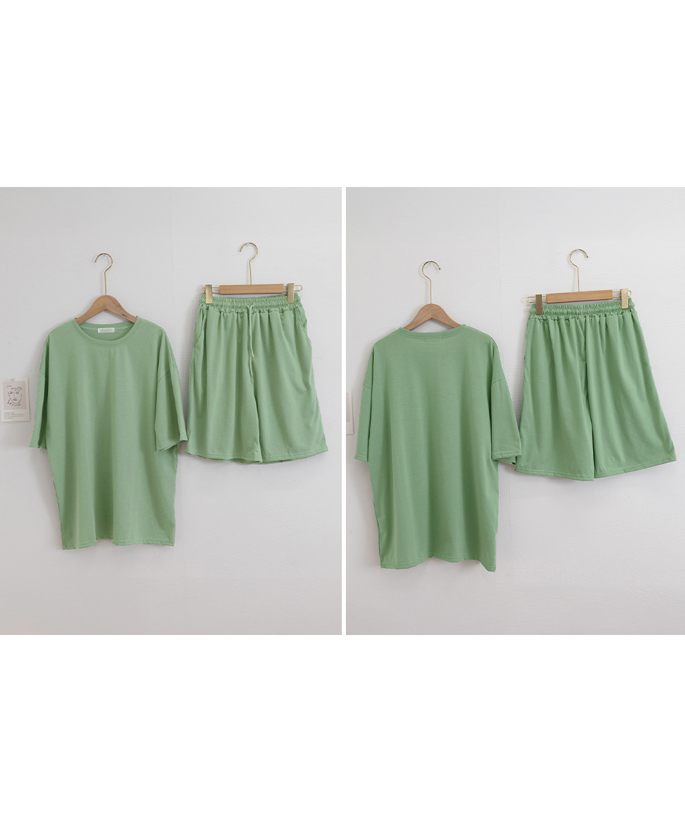 ゆったりとした半袖トップスとショートパンツの上下セットです。