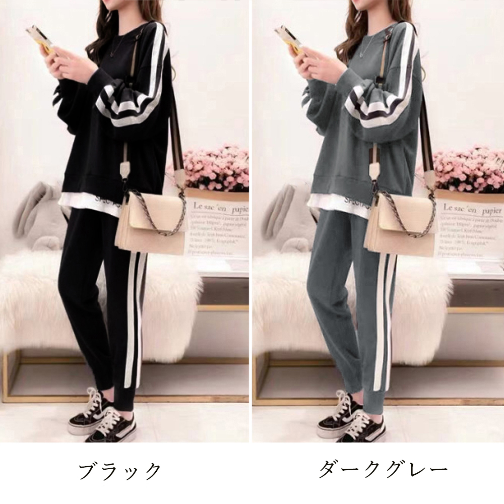 カラー:ブラック/ダークグレー サイズ:ワンサイズ(2XL) トップス: 着丈:約70cm 肩幅:約58cm 袖丈:約54cm ゆき:約83cm 身幅:約56cm 胸囲:約112-140cm ボトムス: 着丈:約95cm 股下:約66cm ウエスト:約60-90cm(ゴム仕様) ヒップ:約102-130cm もも周り:約60-88cm 裏地:なし 伸縮性:あり 透け感:なし ※すべて平置きサイズです(採寸方法違いより、多少の誤差がございますので、ご了承ください)。